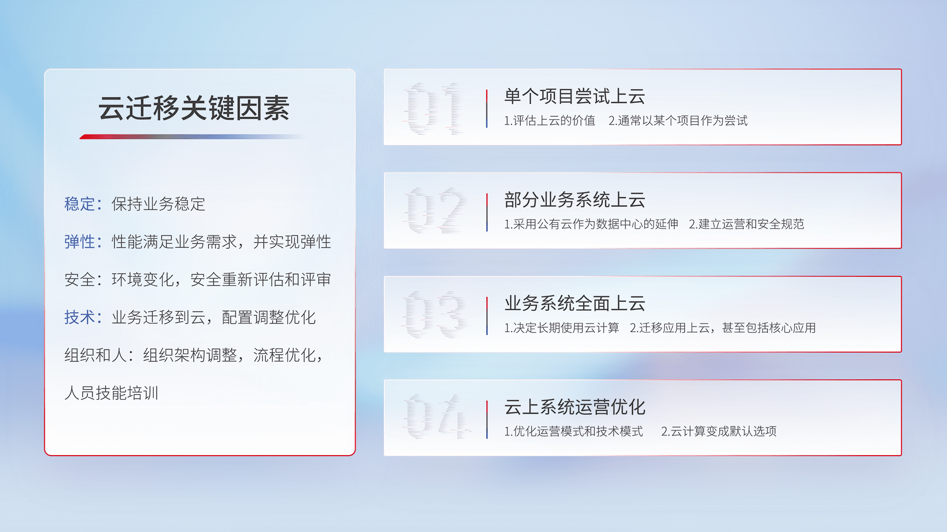 结合实际业务,,从规划设计、、、云平台选型、、云原生改造、、、、数据迁移、、、、集成交付,,迁移全过程为客户识别最佳上云路径,,,做好风险识别管理,,设计网络架构、、、身份权限、、安全审计合规、、、、操作审计、、日志审计、、、监控告警策略、、多站点容灾设计等,,,,对云上基础设施进行整体规划,,,,提升IT治理水平,,,,以满足弹性、、高可用、、、、高性能的需求。。。。
